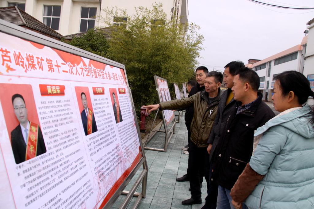 日前,芦岭矿将矿井一批优秀科技人才的先进事迹和优秀科技成果制作成图文并茂的展板在工广展出,营造尊重劳动、尊重知识、尊重人才、尊重创造的浓厚氛围。图为该矿职工在展板前驻足观看。