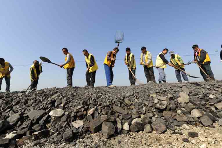 工人在两面环水的路基上充填矸石
