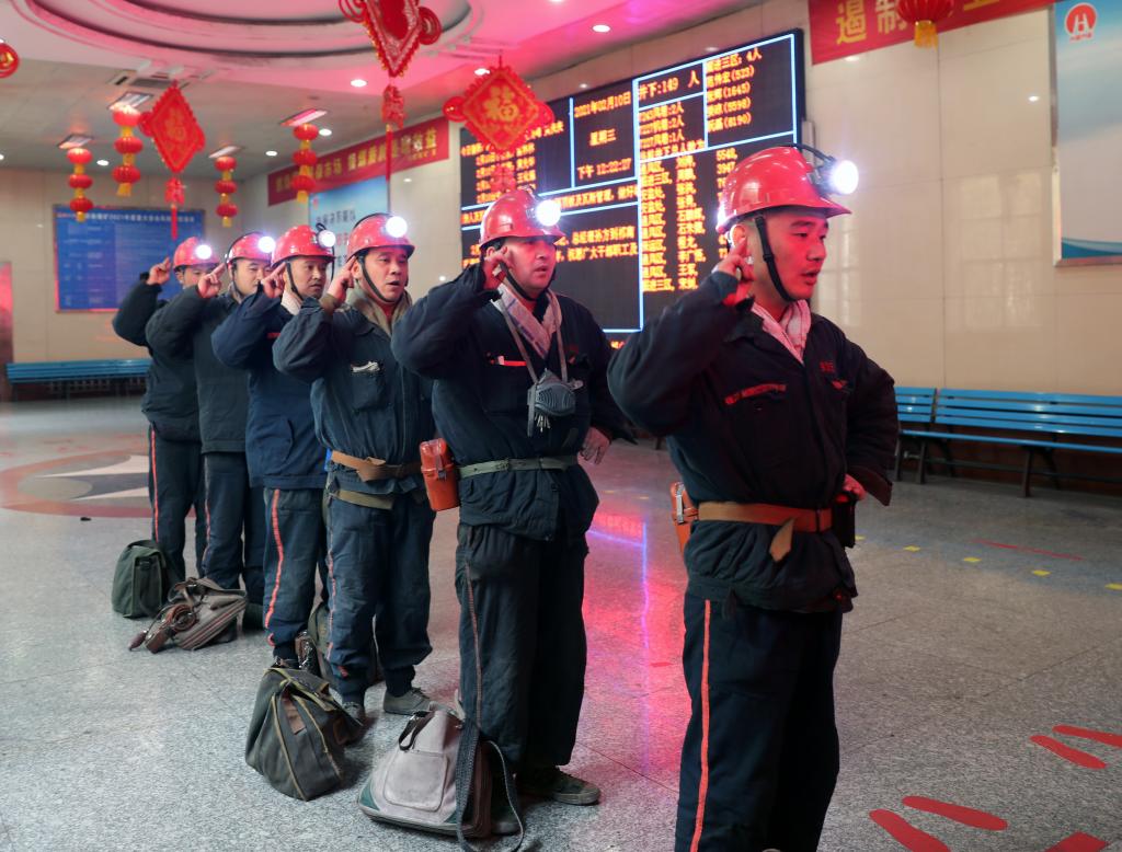 春节放假留守入井人员进行入井前的安全确认。入井职工个个精神抖擞,铿锵有力的安全确认声久久回荡在井口候罐大厅。