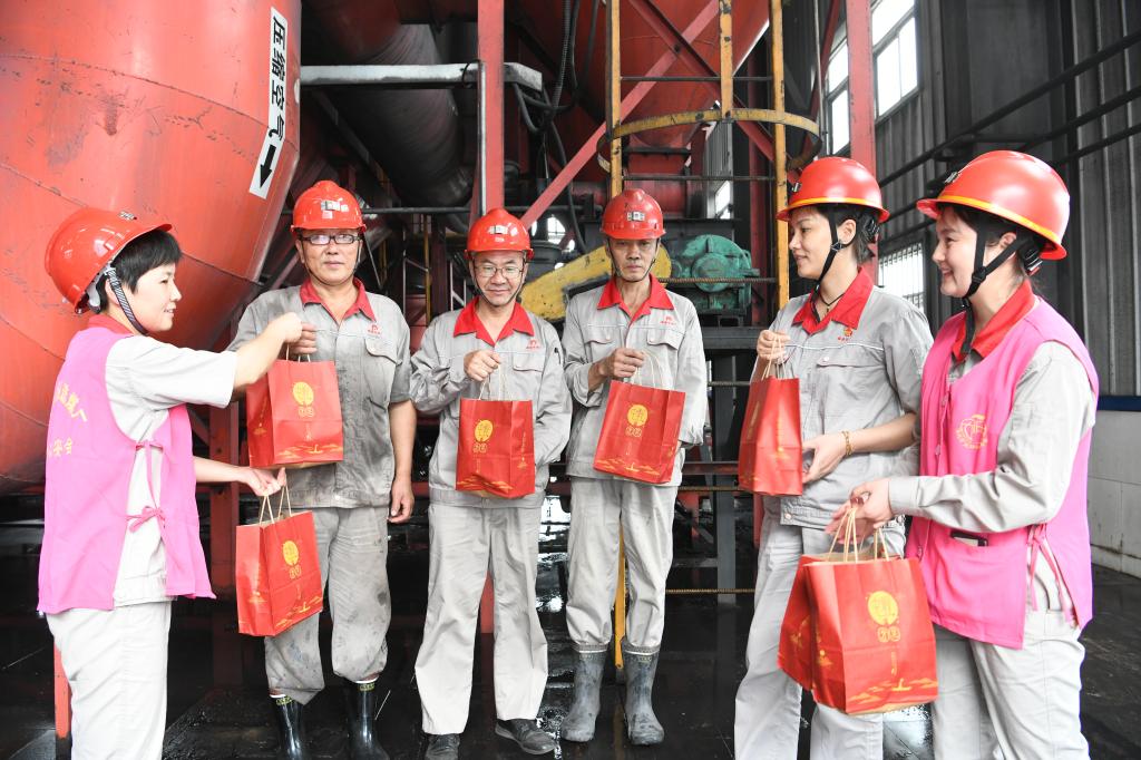 9月17日,临涣选煤厂工会工作人员带着月饼、牛奶、火龙果等大礼包下车间、进班组、到岗位,为中秋、国庆“两节”期间坚守岗位的员工送上“安全大礼”和“安全警语”,嘱咐员工生产工作再忙、安全时刻不忘。(撰稿、摄影:石启元 审核:朱丽)