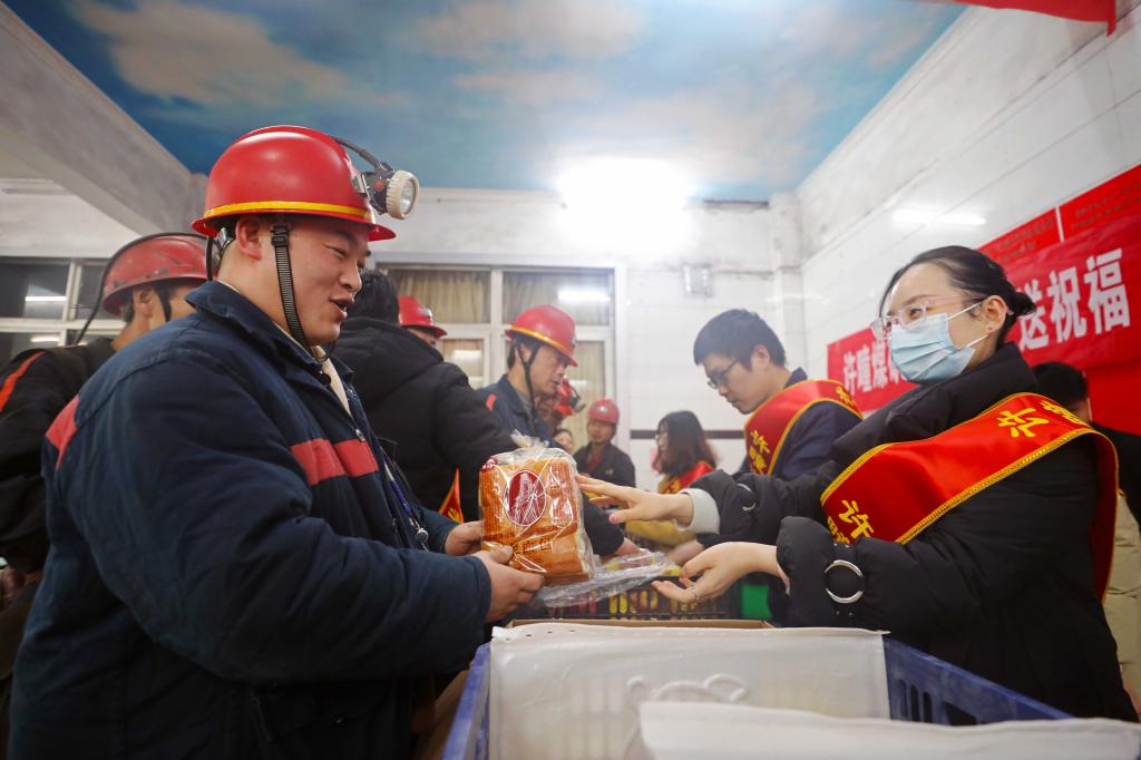 1月25日中午,许疃矿副井口,一句句安全祝福和嘱托,吸引了刚上下班的职工们停住脚步。一群年轻的志愿者,一边叮嘱大家上班注意安全,一边为大家送上面包、牛奶、苹果、八宝粥和美好的新春祝愿。
