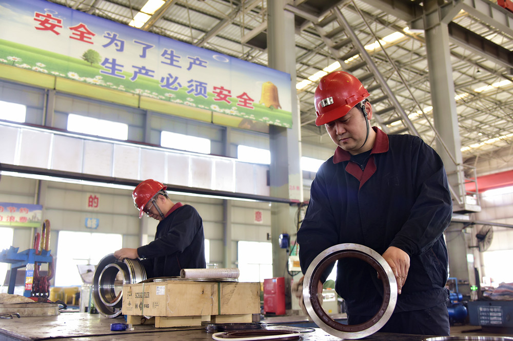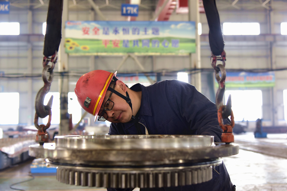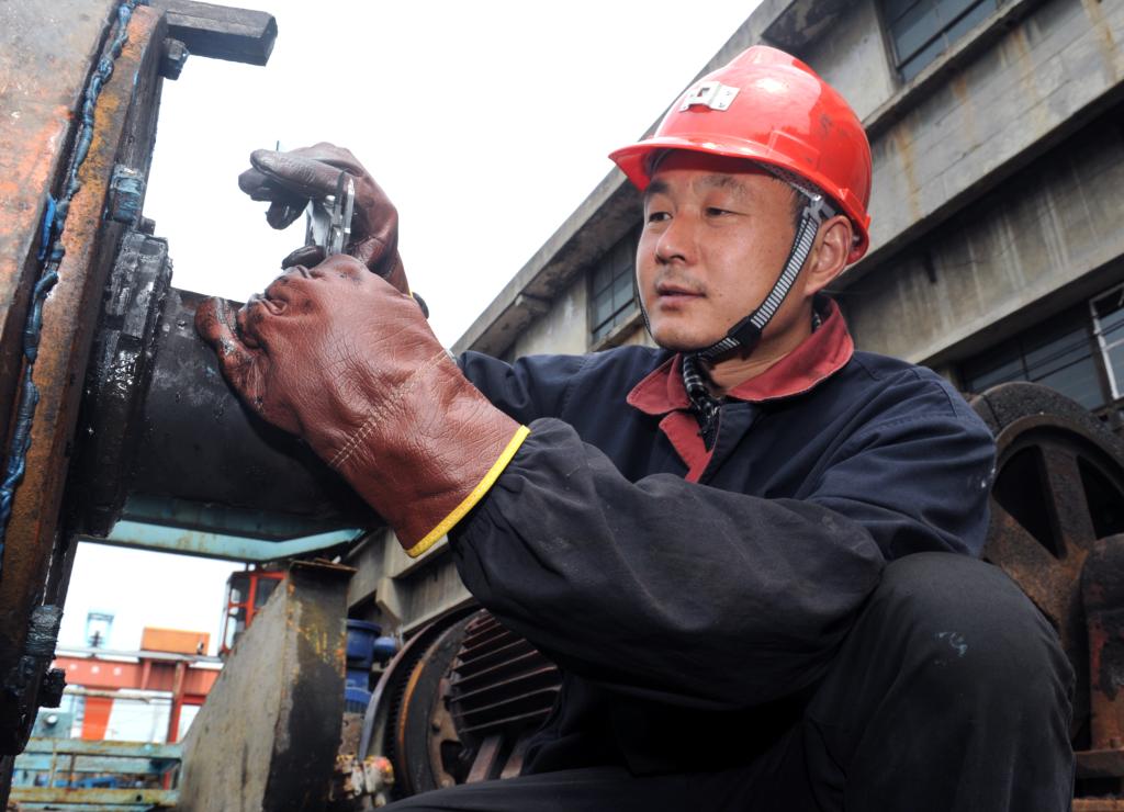 机电维修工李超正在测量绞车齿轮轴尺寸,加工齿轮轴平键。