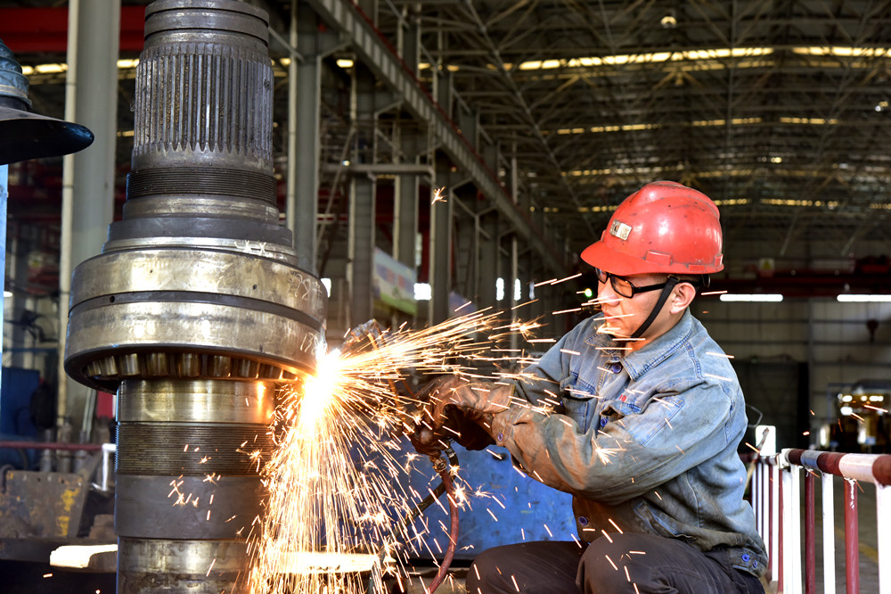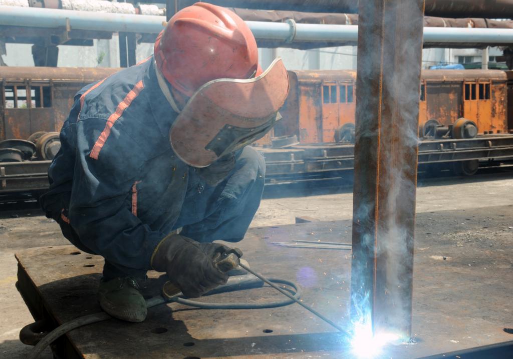 井下电钳工房海涛正在焊接平板车站柱,确保使用单位安全可靠使用。