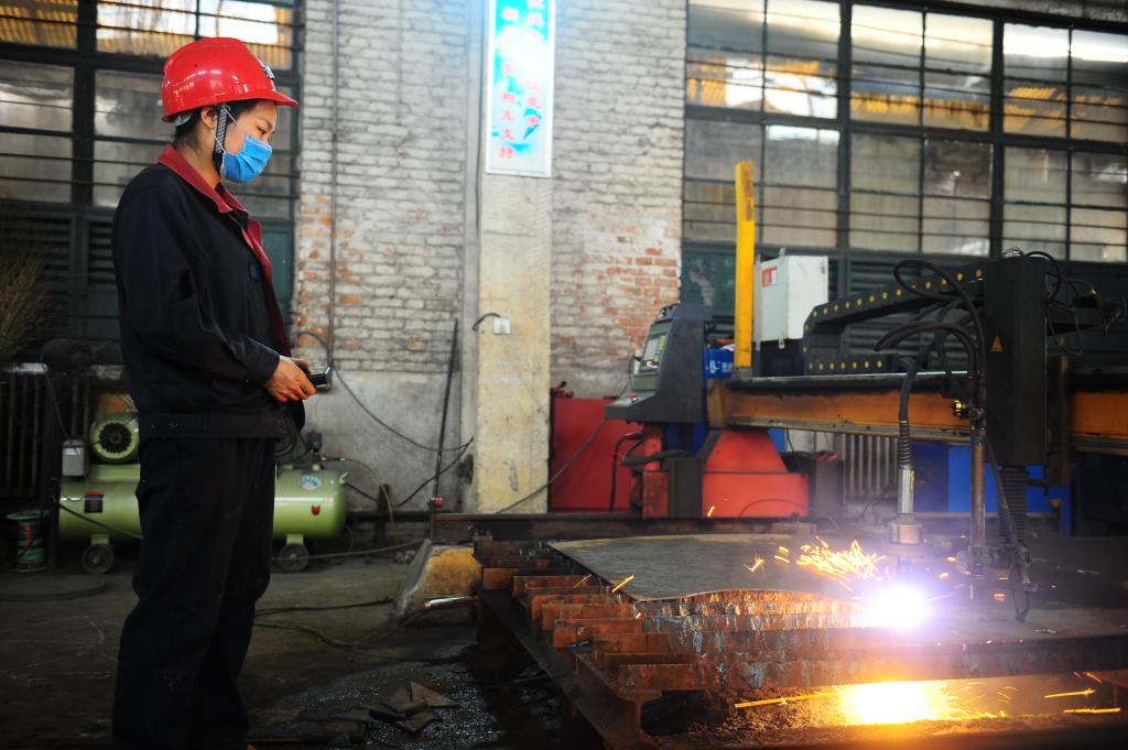 车床操作工张庆杰正在操作数控等离子火焰切割机切割钢板。