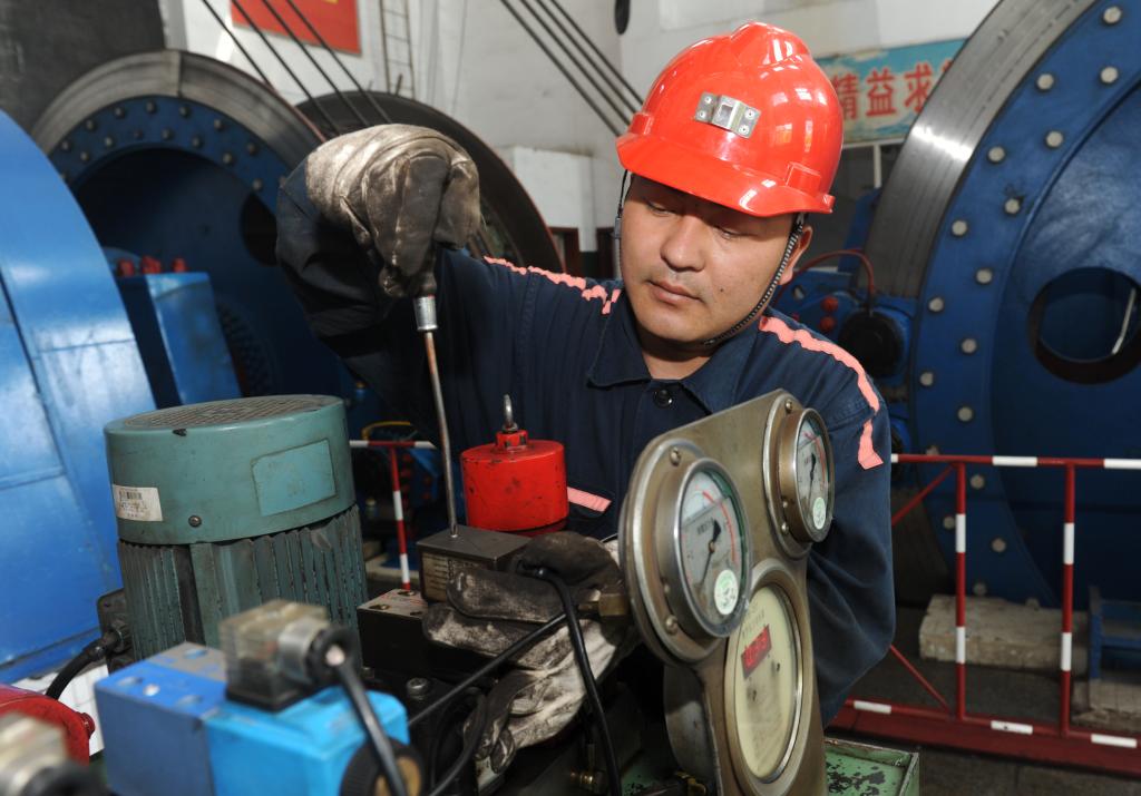 矿井维修电工刘珍珠维护副井液压站,确保副井安全提升。