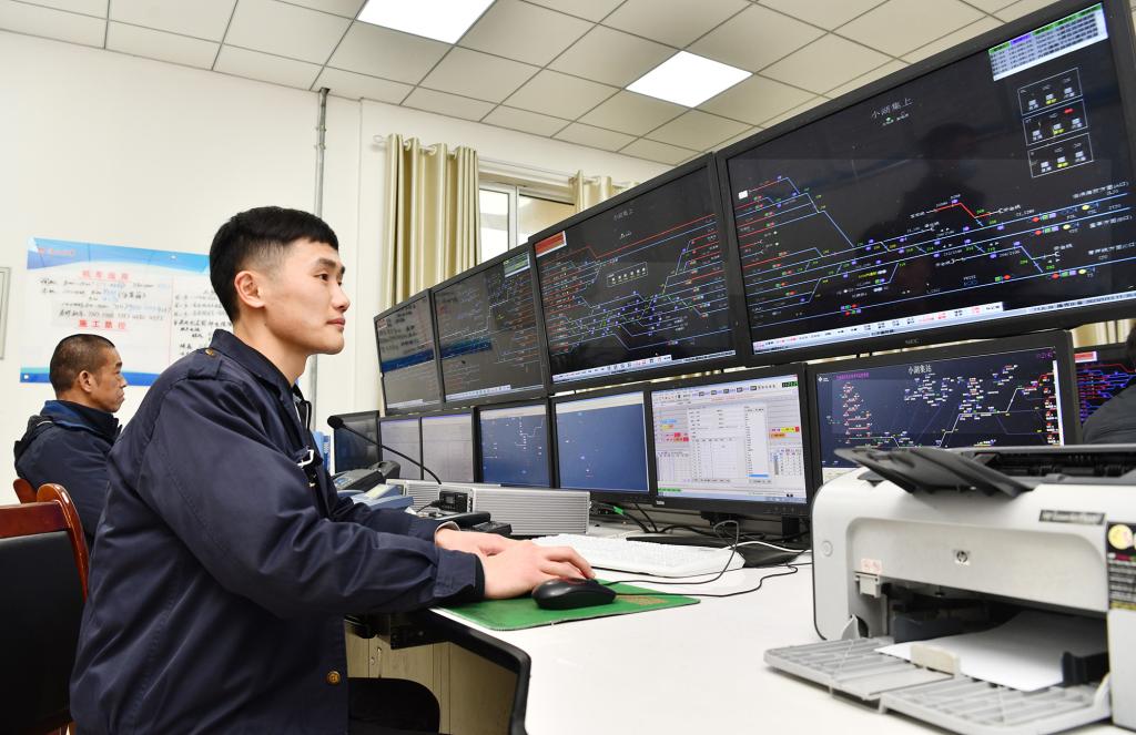 走进保列车畅通的“大脑中枢”铁运处调度所,两名工作人员正在电脑前进行列车调度工作,面前的超大电子屏显示着新区23个车站的列车运行情况,密密麻麻的线条不时跳动着红色和绿色。调度员程存远时刻关注着列车运行图,盯控列车的运行状态,站场的列车分布情况都在他的脑海中。“湖集站卸空K车3401次去临涣,3437次去孙疃站......”一条条指令从这里准确下达。