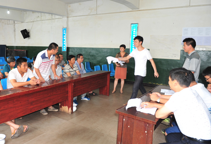 图为:8月25日中午,公司东部井职教办负责人正在运输区会议室随机抽考出勤职工的安全知识,答对者可以获得一份小奖品。