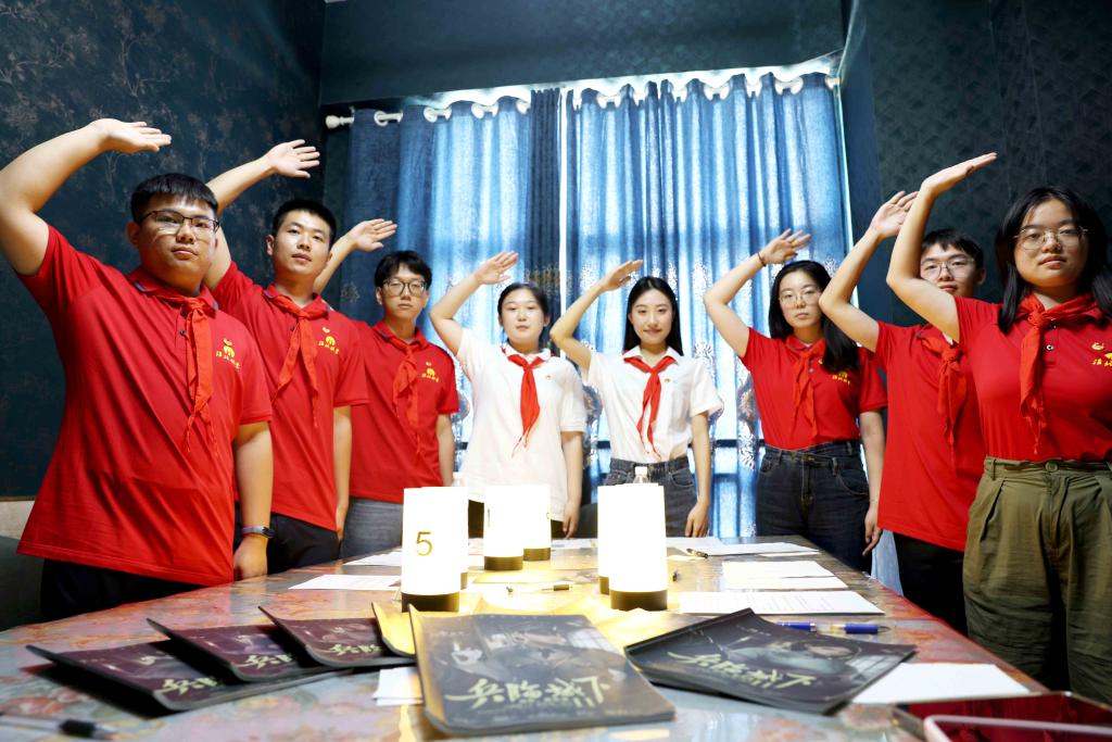 这是一场沉浸式的红色剧本体验,这是一场穿越时空的对话。红色剧本体验馆内,青年们7人一组、8人一队分组走进剧本室。游戏过程中,大家各有角色,在主持人的引导下,一步步揭开那段鲜红的历史事件和感人故事,共同重温峥嵘岁月、感受革命艰辛、汲取前进力量。