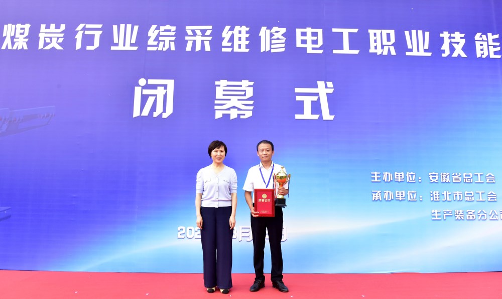 图为屈彦飞(右一)在安徽省煤炭行业综采维修电工职业技能竞赛闭幕式上登台领奖