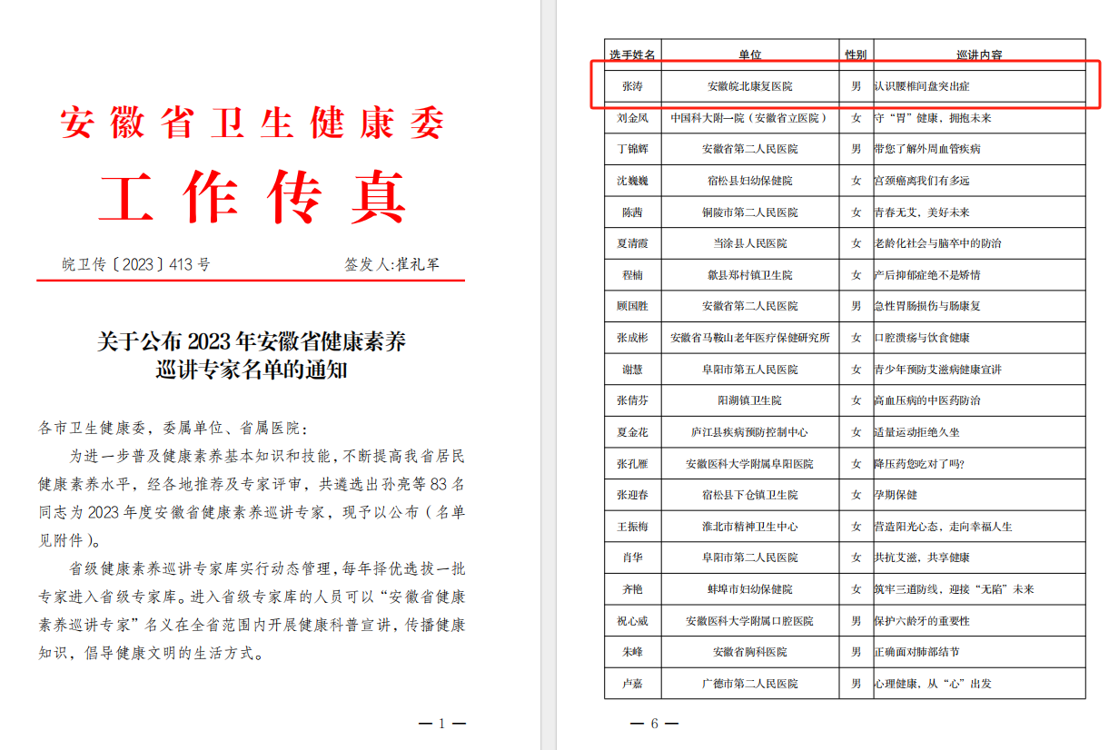 日前,安徽省卫生健康委下发《关于公布2023年度安徽省健康素养巡讲专家名单的通知》,相王健康中医馆主治医师张涛成功入选,成为省级健康素养巡讲专家。