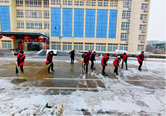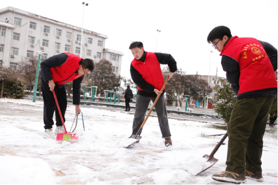 青年志愿者们身穿红色“战袍”,手持扫帚、挥舞铁锹,齐心协力、默契配合,干劲十足、热火朝天,忙碌的身影在皑皑白雪中构成了一道美丽的风景线。