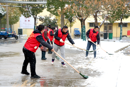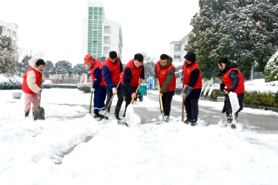 为防止积雪成冰,确保职工出行安全,桃园矿团委迅速行动,组织矿“太阳石”青年志愿者齐心协力,共同清除路面积雪。