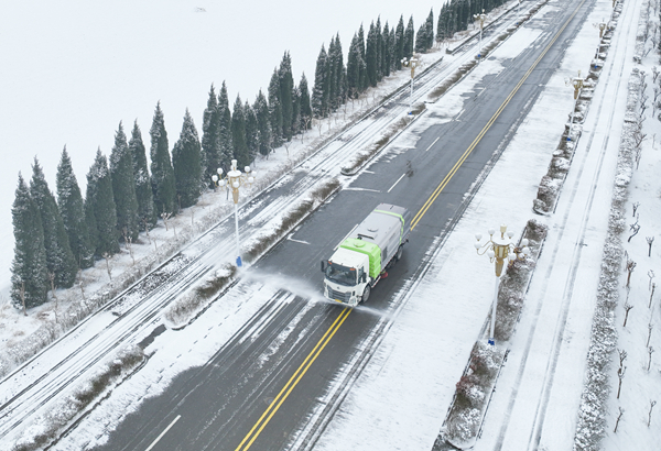 孙疃矿立即启动应急预案,出动人员和设备上路除雪保畅通。(陈更摄)