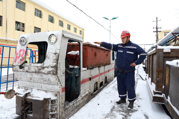 桃园矿运输区一名职工对电机车安全运行状态进行安全确认。(陈敏奎摄)