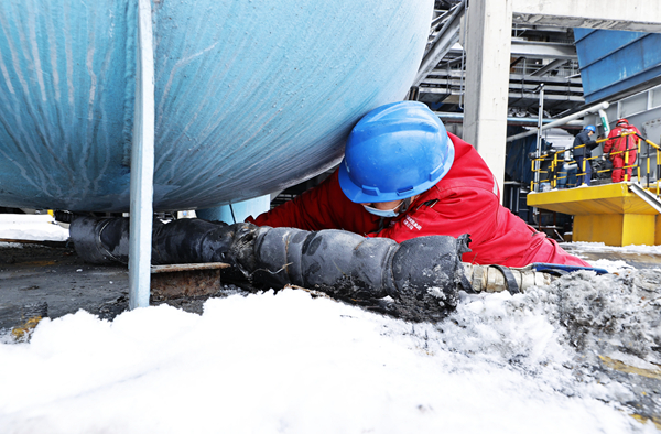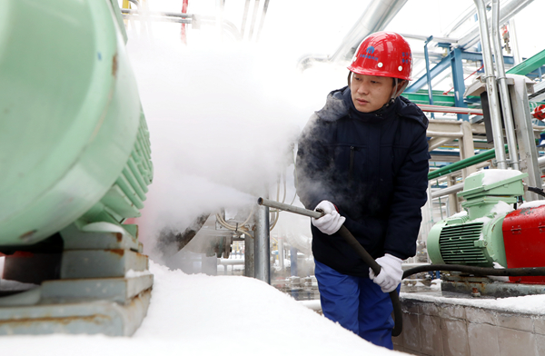 碳鑫科技一名职工用蒸汽为设备除雪除冰,保障设备运行正常。(王明明摄)
