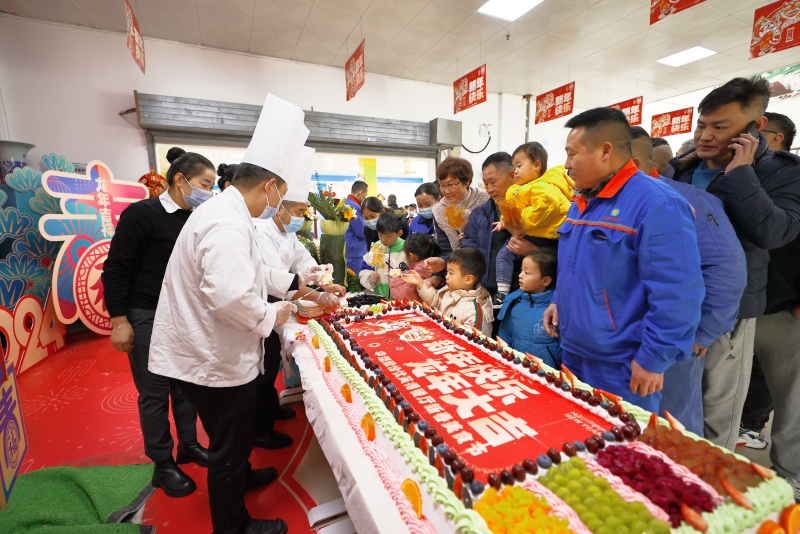 美食节现场摆放巨大蛋糕,中国龙、五彩装饰点缀出节日的喜庆和浓浓的年味。
