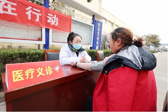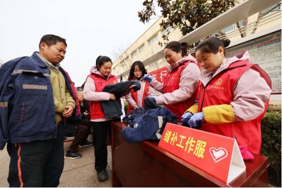 和煦的阳光下,志愿者们身穿红色马甲,分成五个小组,在职工经常路过的道路旁,支起了“摊位”,开始了“缝补衣物、配钥匙、照证件照、刷车、量血压”等多种便民服务活动。