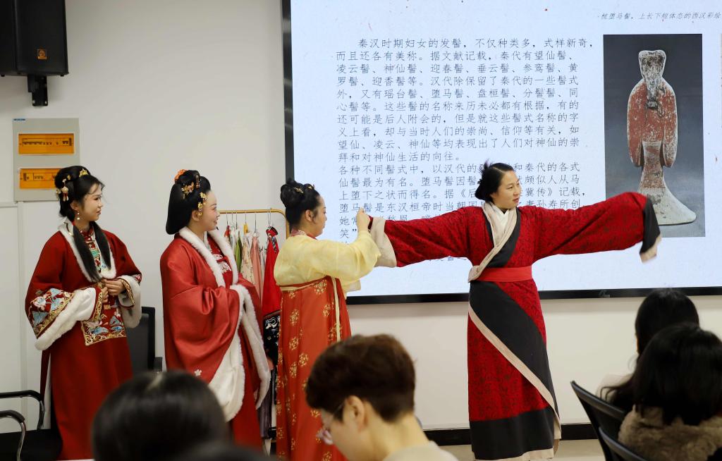 在“三八”国际妇女节即将到来之际,3月6日下午,淮北煤电技师学院工会召集全院女职工举行了一场主题为“赏华美汉服 展文化自信——汉服各朝形制”礼仪文化讲座。通过聆听讲座和试穿、展示、交流,女职工对汉服文化有了更加深入的了解,激发了热爱民族文化的热情,强化了民族自信,也鼓舞了干事创业的精气神。(王永生)