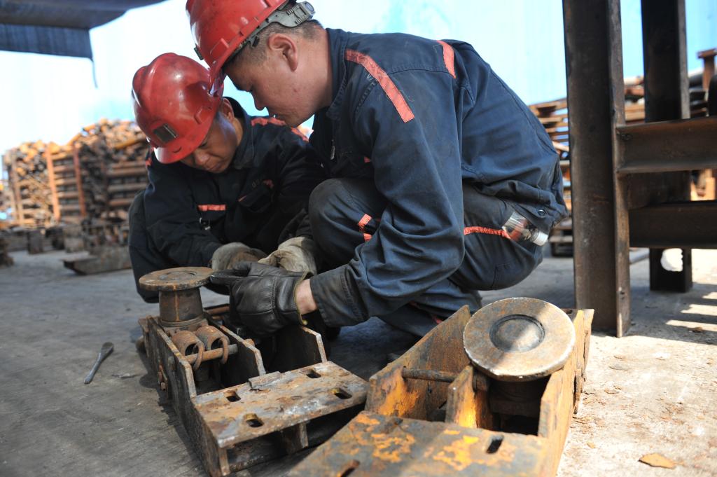 青东煤业完善内部市场化机制,激活内部市场,激发职工开展回收复用、修旧利废活动的积极性,减少材料投入,有效降低了企业生产成本。图为该公司保运区职工自修无极绳压绳轮组。