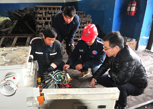 图为:11月24日上午,朔石矿业东部井采煤一区技术员张东在对采掘电钳工进行矿用开关业务训练。(责编 姚春雷)
