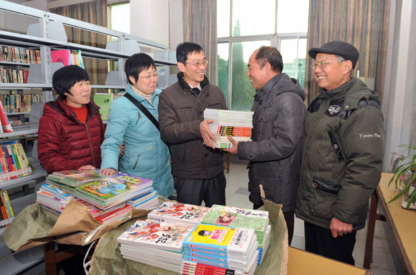 12月4日,淮北选煤厂社区流动儿童图书站又添新书目,淮北市图书馆工作人员送来了文学、科普等600余册崭新的儿童读物。在严峻煤炭经营形势下,该厂在关心下一代工作中积极开拓利用社会资源,探索社会化志愿服务模式,去年与淮北市图书馆共同建立了当地首家流动儿童图书站,职工子女不出社区就能免费看到图书,满足孩子们的阅读需求。图为:当日,该厂关工委老同志接过北市图书馆工作人员赠送的图书。