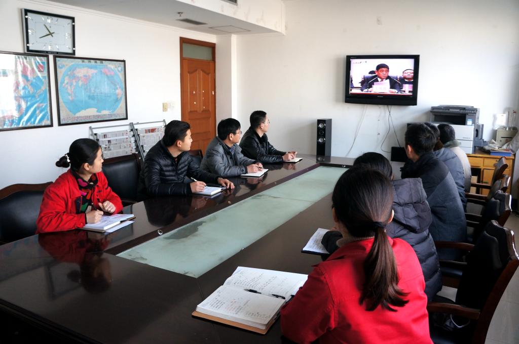 12月29日,涡北矿组织全矿干群以支部为单位,在会议室收听收看淮北矿业六届五次职工、工会会员代表大会暨2016年度工作会现场直播。