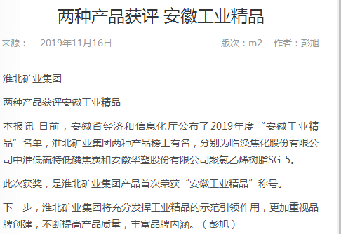 《中国煤炭报》:淮北矿业集团两种产品获评 安徽工业精品