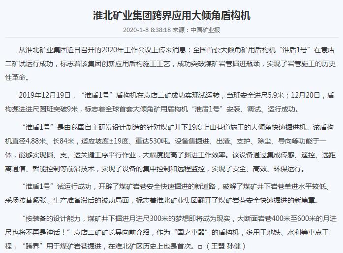 《中国矿业报》:淮北矿业集团跨界应用大倾角盾构机