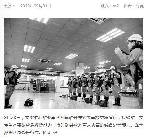 《中国煤炭报》:淮北矿业集团孙疃矿开展火灾事故应急演练