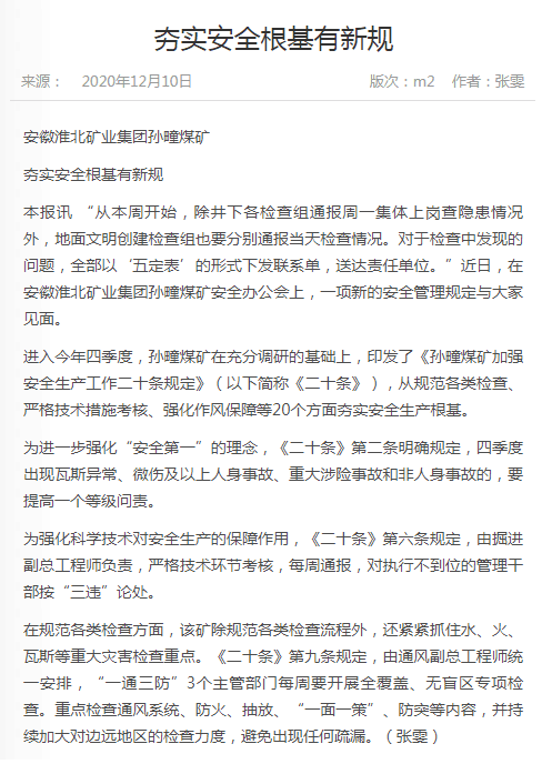 《中国煤炭报》:淮北矿业集团孙疃矿夯实安全根基有新规