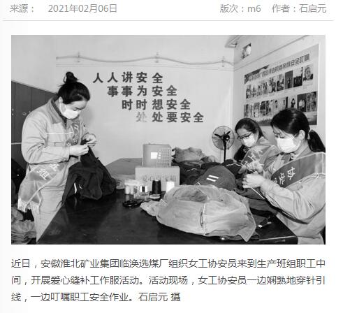 《中国煤炭报》:淮北矿业集团临涣选煤厂开展爱心缝补工作服活动