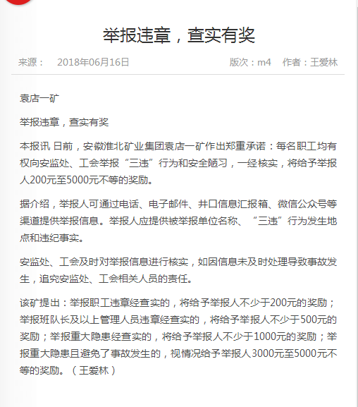 《中国煤炭报》:举报违章,查实有奖