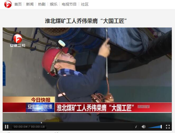 7月10日,安徽电视台《安徽新闻联播》节目播出淮北矿业袁店一矿瓦检工乔伟荣膺“大国工匠”消息。