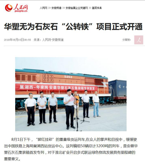 在巢湖西——年家岗石灰石集装箱专列开通仪式上,淮北矿业股份公司副总经理兼现代物流贸易公司党委书记、总经理邵华指出,安徽华塑无为矿山石灰石原料供应实现“公转铁”集装箱运输,是淮北矿业和中国铁路上海局践行党中央提出的绿色发展理念,推动淮北矿业物流贸易板块转型升级,实现低碳环保、高效运营、互利共赢,成就路企合作典范的一次创新之举。他强调,巢湖西站“公转铁”集装箱运输业务的开拓,既符合国家绿色环保要求,又消除了恶劣天气对汽车运输影响的短板,减少了货物破损率,提高了货运效率,为保障安徽华塑股份公司稳定的货源供应渠道提供了可能。