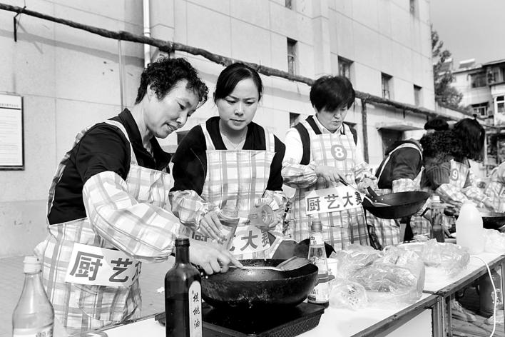 10月16日,淮北矿业集团桃园煤矿工会举办的“绿色厨艺 安全我家”比赛现场上,参赛的婆媳携手精心制作精美菜肴,展示娴熟厨艺。陈敏奎 摄