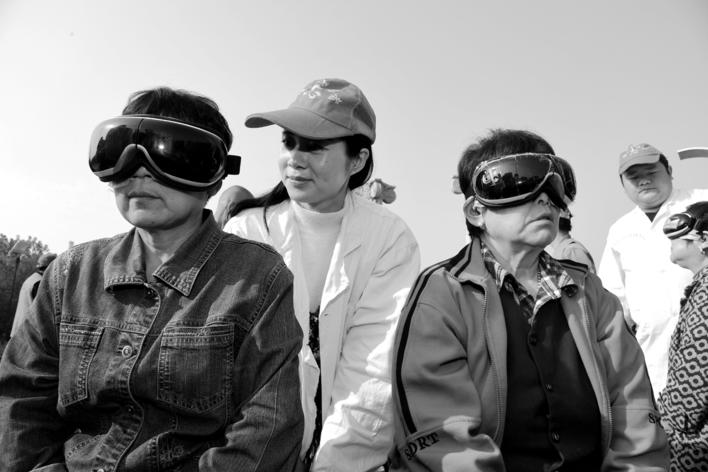 他们为居民提供了常见疾病的预防及治疗、日常保健等方面的咨询服务,一上午的时间,共为社区居民提供了上百人次的服务,受到了社区居民的一致好评。图为一名志愿者正用仪器为两名社区居民进行眼部按摩。(张宗风)