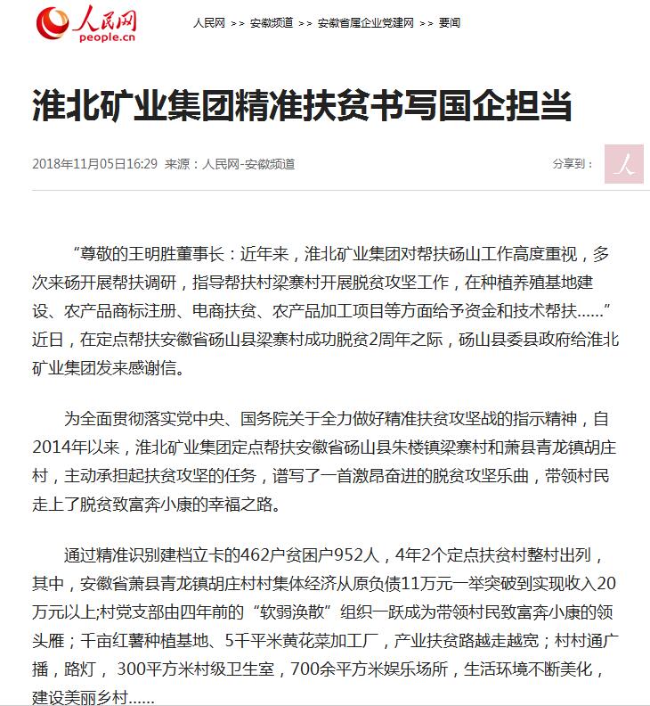 淮北矿业集团党委是“全国先进基层党组织”,实施精准扶贫,打赢脱贫攻坚战,没有一个坚强党组织是办不到的。在淮北矿业集团定点扶贫动员会上,淮北矿业集团党委为扶贫工作队指明了方向。