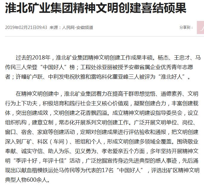 《人民网》:淮北矿业集团精神文明创建喜结硕果