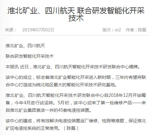 《中国煤炭报》:淮北矿业、四川航天联合研发智能化开采技术