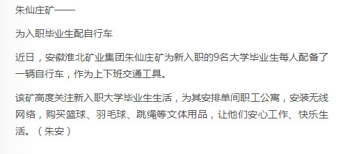 《中国煤炭报》:淮北矿业集团朱仙庄矿为入职毕业生配自行车