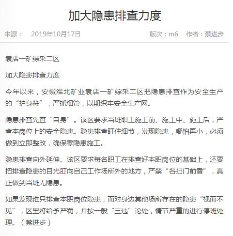 《中国煤炭报》:淮北矿业袁店一矿综采二区加大隐患排查力度