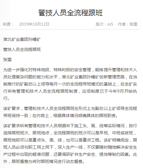 《中国煤炭报》:淮北矿业集团孙疃矿管技人员全流程跟班